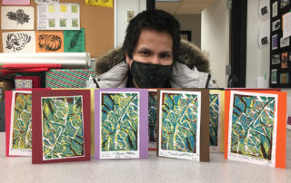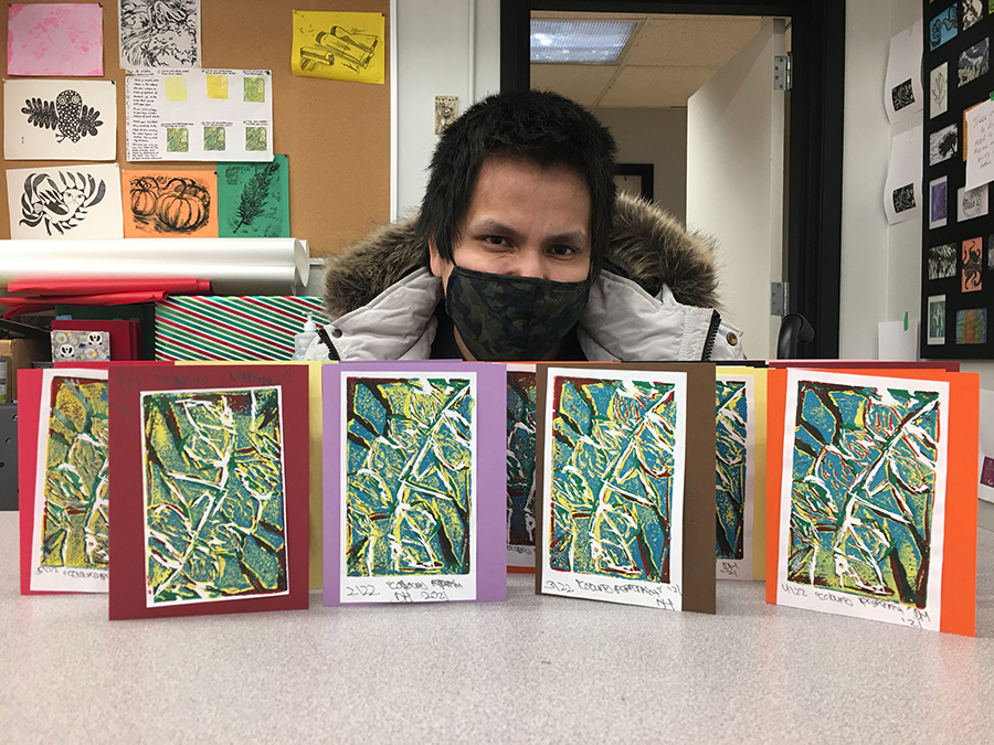 We extended the printmaking course into the early spring to give students more time with their projects. Also I had to teach from home using Zoom due to health concerns. In spite of this challenge my students kept coming to class and making art! Their dedication impressed me. Many thanks to them and to staff members who supported us to keep classes going virtually.