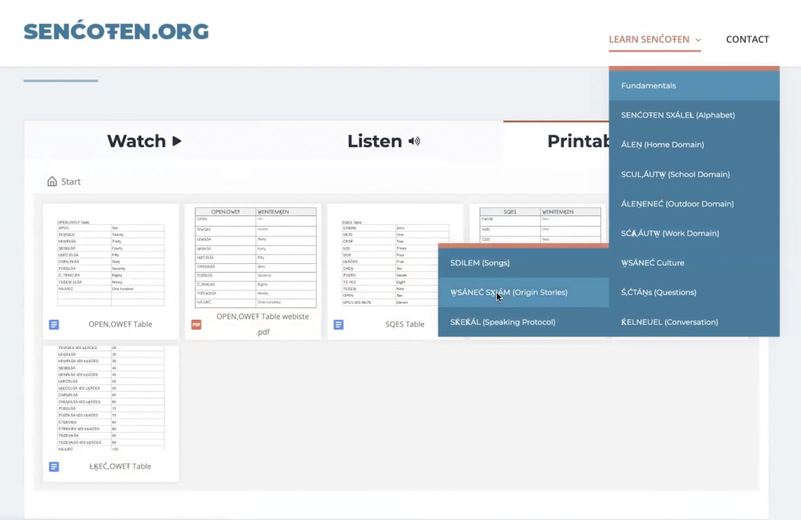Shown above, is a sneak preview of SENĆOŦEN.org. The website will be an incredible go-to resource of Origin Stories, Written, Audio and Printable resources categorized into easy & intuitive language domain categories like School, Home, Work, Outdoor, Questions, Conversation, Culture and songs.