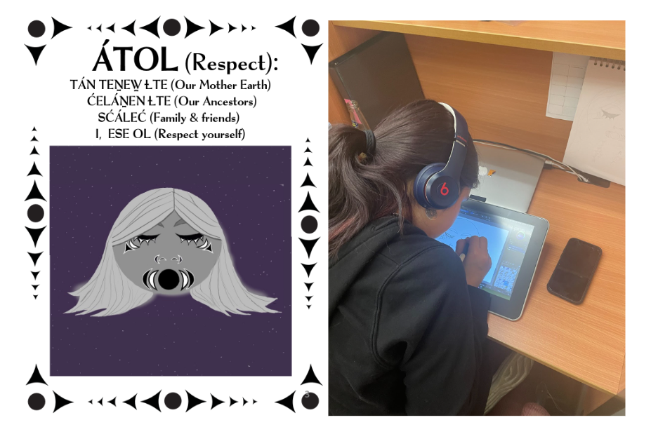 SILE ȽḴÁLJ: Grandmother moon. Shown above: A sneak preview of some of the artwork created by one of the SȾÁSEN junior apprentices LIQIŦIÁ Elliott, 14, of the BOḰEĆEN/W̱JOȽEȽP village that could potentially be used on posters aimed to promote the 13 W̱SÁNEĆ Values. The posters and books will be ready in Spring 2023.